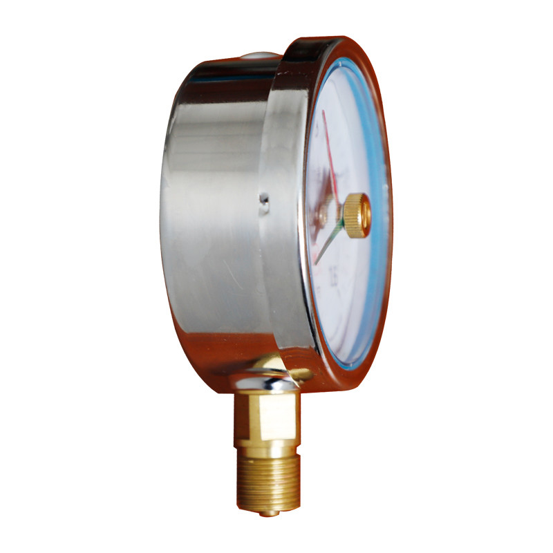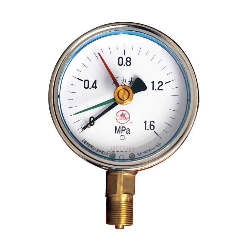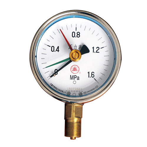 定位壓力表主體為Ф60  Ф100  Ф150各型壓力表(如普通壓力表、耐震壓力表等),內(nèi)部加裝設(shè)定裝置組成各型定位壓力表。定位壓力表可任意調(diào)正設(shè)定壓力指針,可清晰標(biāo)定工作壓力的上下限位置,用于警示現(xiàn)場(chǎng)操作人員。定位壓力表適用測(cè)量無爆炸,不結(jié)晶,不凝固,對(duì)銅和銅合金無腐蝕作用的液體、氣體或蒸汽的壓力及真空。廣泛應(yīng)用于石油、化工、冶金、液壓機(jī)械等工業(yè)過程壓力測(cè)量。